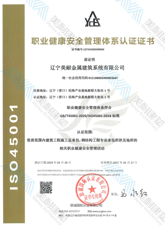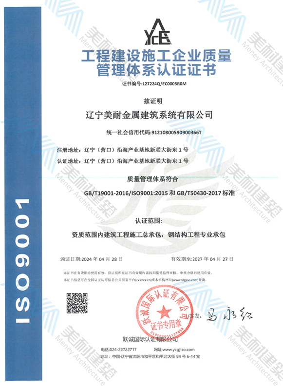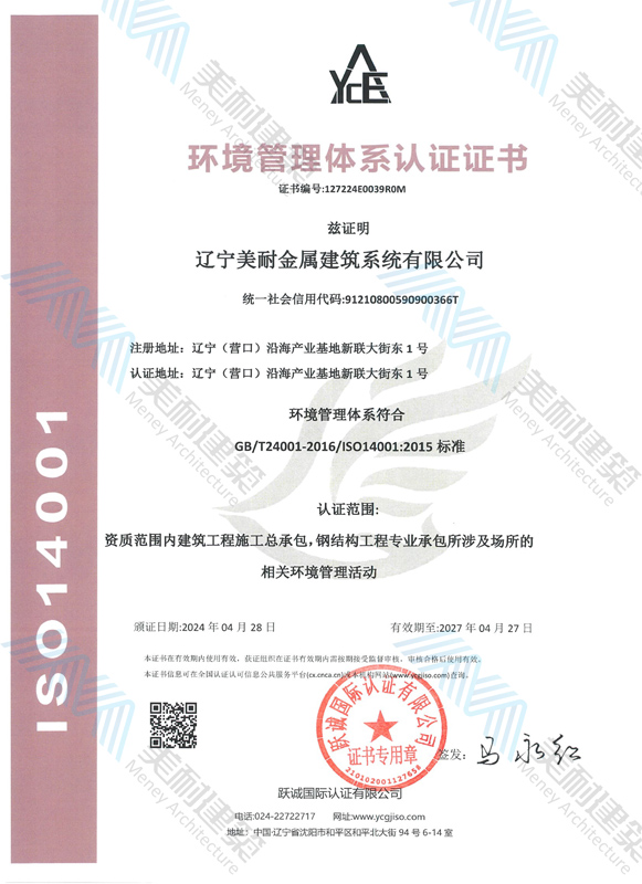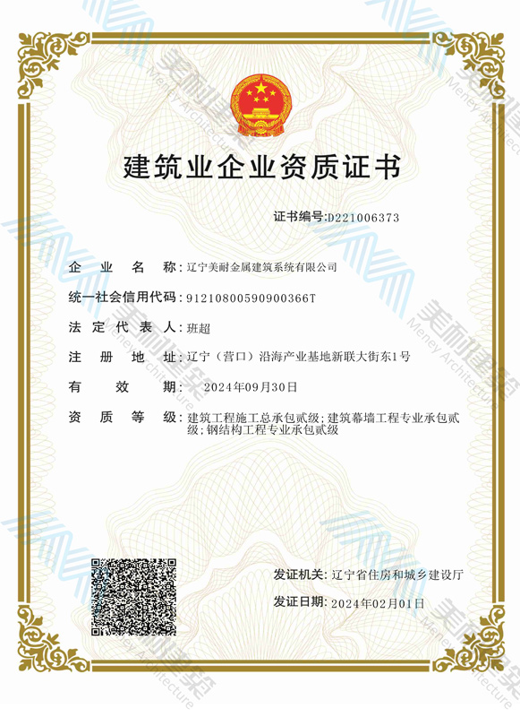 遼寧美耐金屬建筑系統(tǒng)有限公司位于遼寧(營口)沿海產(chǎn)業(yè)基地,專注于預制金屬建筑系統(tǒng)領域,是一家集工業(yè)建筑設計、制作、施工及相關的技術咨詢與服務為一體的綜合性服務企業(yè)。作為國家鋼結構協(xié)會會員、中國建筑金屬結構協(xié)會會員單位與國家高新技術企業(yè),美耐建筑集建筑工程施工總承包、鋼結構工程專業(yè)承包等多種資質(zhì)于一身,并擁有22項鋼結構建筑領域?qū)@?項軟件著作權。
